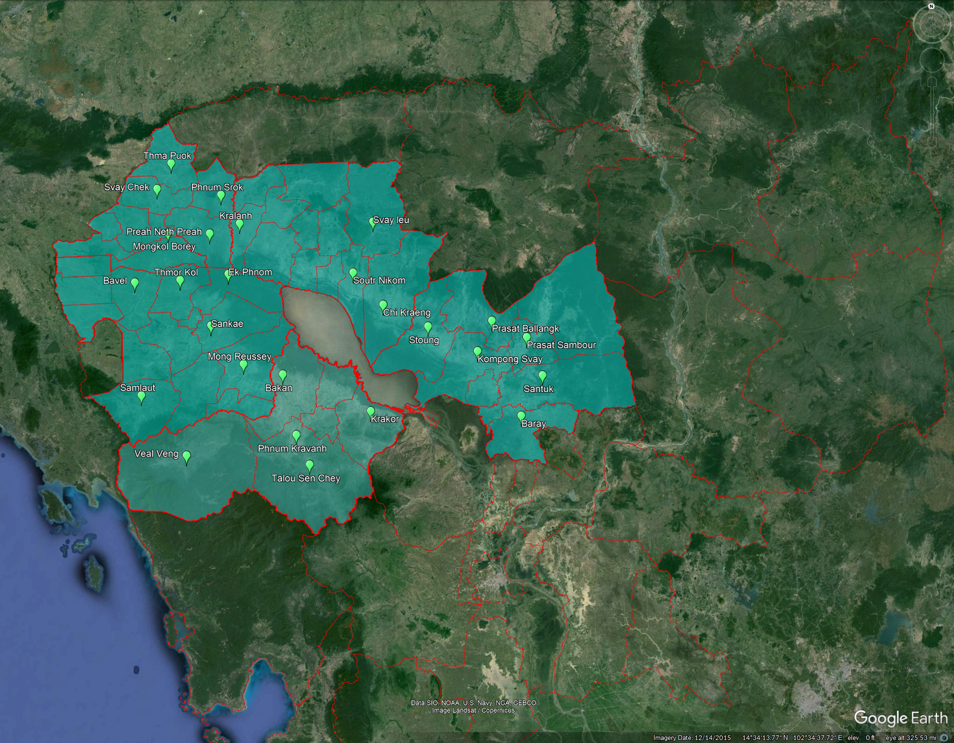 គម្រោងការលើកកម្ពស់ជីវភាពធន់នឹងអាកាសធាតុនៃសហគមន៍ផលិតស្រូវនៅតំបន់បឹងទន្លេសាប PCRL ធ្វើការនៅក្នុងខេត្តគោលដៅចំនួន ៥ ជុំវិញបឹងទន្លេសាប រួមមានខេត្តពោធិ៍សាត់ បាត់ដំបង បន្ទាយមានជ័យ សៀមរាប និងកំពង់ធំ ដែលគ្របដណ្តប់ឃុំសរុបចំនួន ៤០ ក្នុង ២៤ ស្រុក ដែលជាតំបន់ដាំដុះស្រូវវស្សាដ៏សំខាន់ និងជាសហគមន៍ងាយរងគ្រោះដែលមានការបន្សុំាតិចតួចទៅនឹងការប្រែប្រួលអាកាសធាតុ។